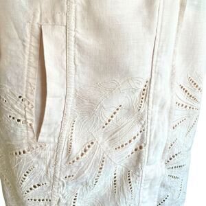 Chico's Pale Peach Linen Duster Jacket Eyelet Detail Sz 12 / LARGE Spring Summer. Back had elastic band for structure. In excellent preowned condition.