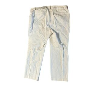 Elevate your office wardrobe with these Chico's pants in a beautiful cream color. The pants feature a flat front, straight leg style, and a high rise waist size of 38 inches. The closure includes a zipper, button, and hook & eye, and the pants are made with a twill fabric type that includes spandex, rayon, and cotton materials for comfort and stretch.