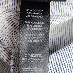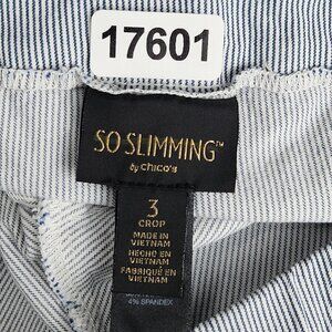 Chico's Women's Size XL (Size 3 in Chico's Sizing) Blue Striped So Slimming Crop Capri Pull-On Pants. In good pre-owned condition. Spot on the front. Please see photos.
