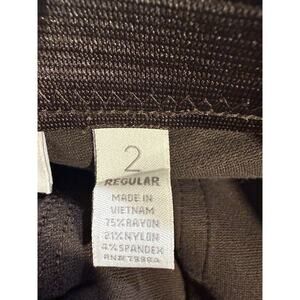These Chico's pants are women's brown slacks in size 2R. They feature a zip and coin pocket, and are part of the So Slimming collection. Made of twill fabric with nylon, spandex, and rayon, they offer comfort and stretch. The pants have a straight leg style, a flat front, and a mid-rise. Suitable for various occasions including travel, workwear, and casual outings, they are easy to care for and have a classic yet modern design.