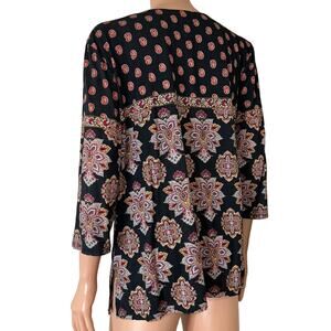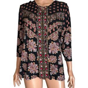 Chico's Parisian Medallion Lace-Up Top SZ 2 (LG) boho flowy 3/4 sleeve neck tie