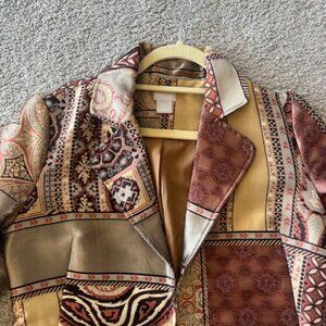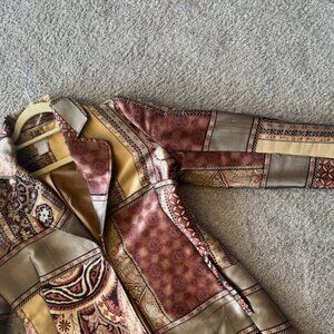 Sparkle in this patchwork coat design by Chico's. The fabric in the coat has a shimmering effect in silver, gold and light burgundy. Fabric is polyester but has a tendency to shed slightly. Size 0
