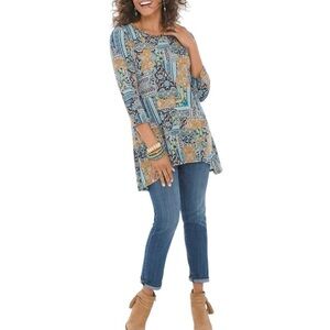 Colorful and flowy Chico’s tunic featuring a vibrant abstract floral patchwork print, metallic hardware cutout detail at the neckline, and a flattering scoop neck. Boho-inspired with 3/4 sleeves and a relaxed, comfortable fit—perfect for casual days or dressed-up occasions.