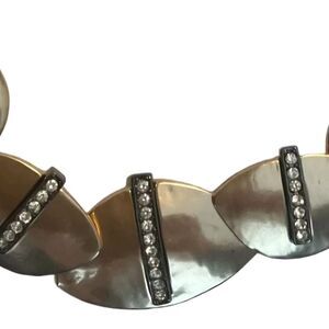 Crafted with five polished, gold-tone geometric plates, the necklace is accented by horizontal pavé rhinestone bars that add a sparkling, luxurious touch. The shapes are delicately linked with a silver-tone chain, offering a striking mixed-metal finish. The adjustable 18" chain, with an additional 3" extender, allows for versatile styling, ensuring a perfect fit for any neckline.