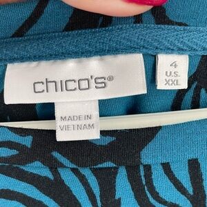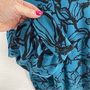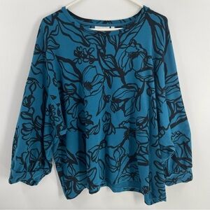 Chicos Peacock Blue Black Floral French Terry Blouson Puff 3/4 Sleeve Sweatshirt