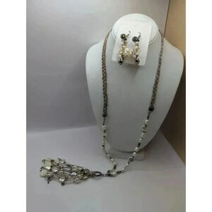 Chico's Pearl Necklace plus Earrings Silvertone Braided Beige Cream Bohemian