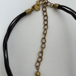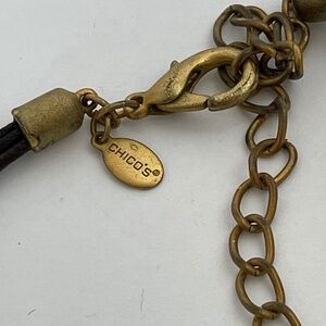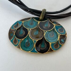 This Chico's multi-strand pendant necklace features a beautiful peacock blue, green, and black design on a cord chain. The enamel oval-shaped pendant is signed by the brand and the cords are made of faux leather material. The necklace is 16 “ and 4” inches extender in length and perfect for a special occasion such as Mother's Day, Christmas, Graduation, Anniversary, Birthday, or Valentine's Day.
