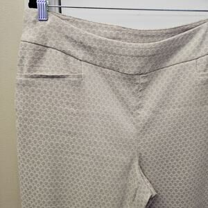 The Chico's Perfect Stretch Fabulously Slimming Josie Slim Ankle Pants in size 3 (US XL) are a stylish and versatile addition to any woman's wardrobe. Made from a blend of nylon, spandex, and rayon, these pants offer a comfortable fit with a high rise and slim leg style. The cream color and geometric pattern make them perfect for various occasions, from casual outings to workwear and business settings. With a pull-on closure and machine washable care instructions, these pants provide both style and convenience for the modern woman on the go.