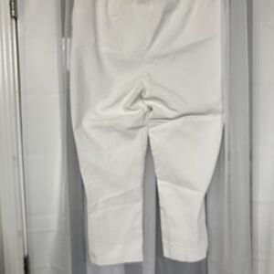 Great closet staple white pull on pants with plenty of stretch. In white. Thick waist band, 2 front slit pockets. Capris have a small slit at the ankle connected with a piece of fabric with grommets on them as shown in pictures. See pictures for fabric care - Made of Rayon, Nylon and Spandex they have stretch to them. Approx. 19” Inseam - Chico's size 2 which equates to a size 12