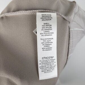 Pull on flat front skort with wide elastic waistband. Textured beige material with vertical white stripes. Straight hem with slits at sides. Solid beige shorts layer. Slanted hip pockets. Chicos size 1 corresponding to a US M or 8.