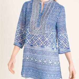 Chico's Petite Blue Mixed Print Silver Sequin Embellished Tunic Top