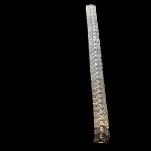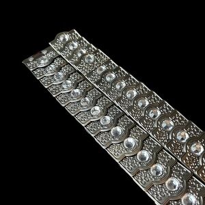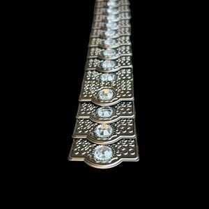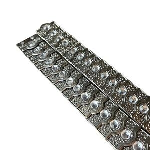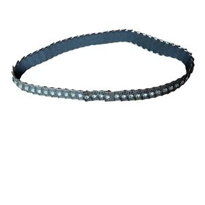 Chico’s pewter / metal toned scale stretch belt with detailed design on each piece as well as a rhinestone accent on each piece. It is a interior slide hook closure that gives the exterior a smooth continuous look. It is a Chico’s size large and has a lot of stretch to it. My measurements are taken without any stretch so it can stretch for a slightly larger measurement if needed. Measurements unstretched is hook is aprox. At about 39 1/8” and total length of belt is 39 3/4” . The belt is 1 3/4” wide. An absolutely beautiful belt!