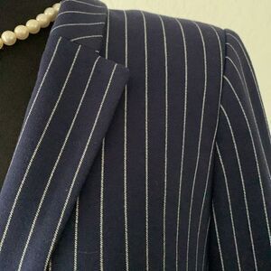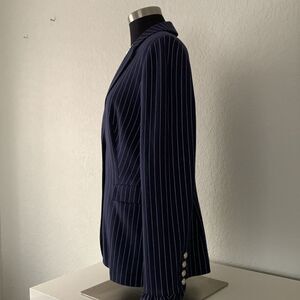 Chico’s Pin Striped Ruffle Cuff Buttons Navy Blue White Blazer Size 0/4