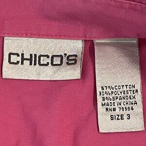 Crafted for elegance and comfort, this Chico's pink button-up shirt is a versatile addition to any wardrobe. The 3/4 sleeves and lightweight fabric make it an ideal choice for transitional weather, offering a blend of style and ease. The collared neckline adds a touch of sophistication, perfect for both office and casual settings.