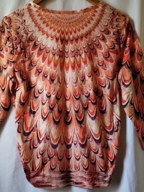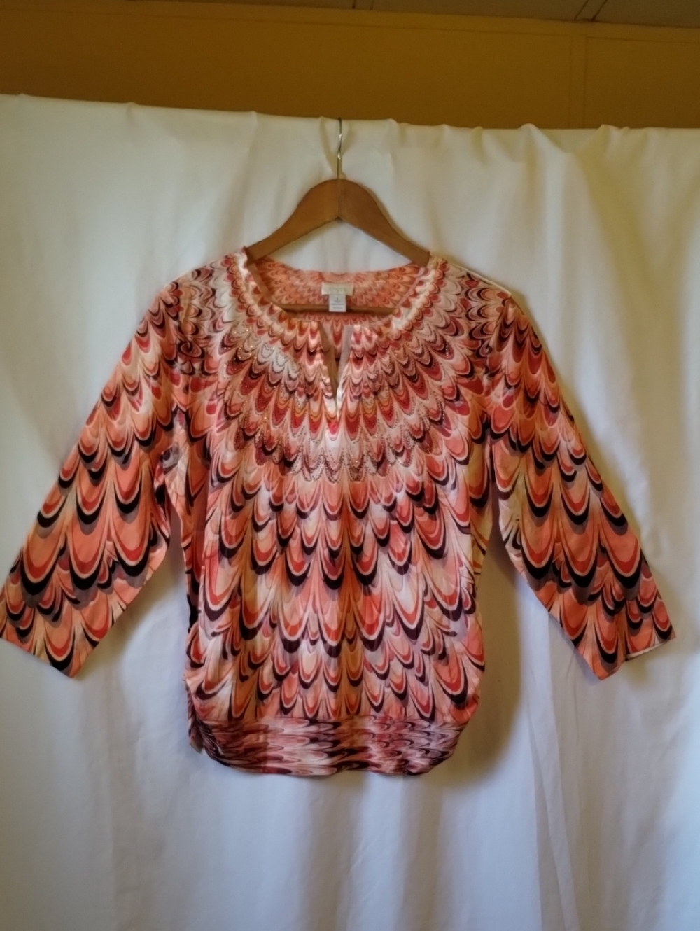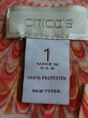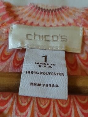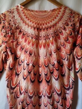 Stylish Chico's tunic in a pink multi-tone scallop pattern. Rounded neckline with a small keyhole. Relaxed 3/4 sleeves for easy wear. Lightweight, soft fabric with fluid drape.