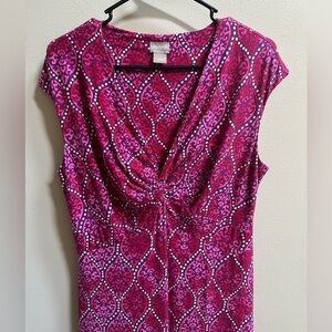 Vibrant Chico’s dress in a bold pink and purple paisley print with a flattering front knot detail. Designed with cap sleeves, a front knot accentuation, and a colorful border hem. The soft, breathable stretch rayon fabric drapes beautifully and provides an easy, comfortable fit. A standout piece for summer vacations, garden parties, or resort dinners.