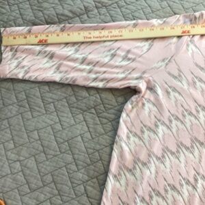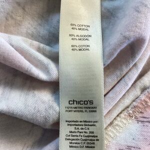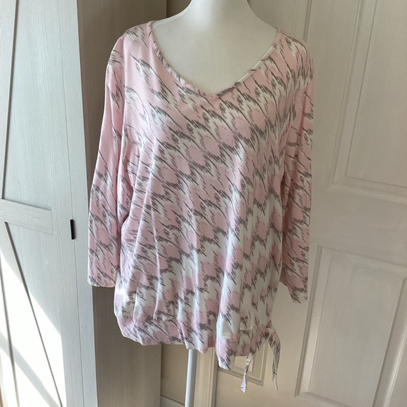Chico's blouse with a pink/Grey and white abstract pattern. Features a relaxed fit and side tie detail. Ideal for casual outings.