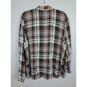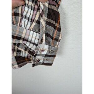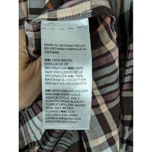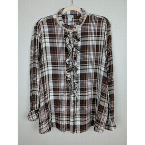 Chico's women's top with a brown, purple, cream, and orange plaid pattern and ruffle front detail. Long sleeves with a two-button closure at the cuff. Button-down closure. Soft and lightweight 100% rayon.