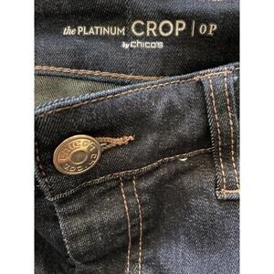 chico's cropped jeans. mid rise blue jeans. chico's platinum line. dark wash denim jeans. women's 0P denim. dark wash cropped pants.