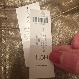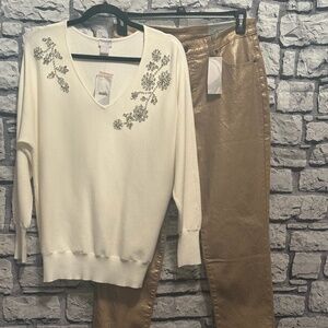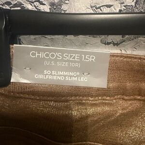 Chicos Platinum Denim jeans in shimmery Gold size 1.5 Reg Fasten button and front zipper , 2 back pockets , 3 front pockets. stretch material for comfort in the Chicos way. Perfect for the Holidays !! Parties !! I have the sweater that would look so nice with these jeans sold separately . From a smoke and pet free home