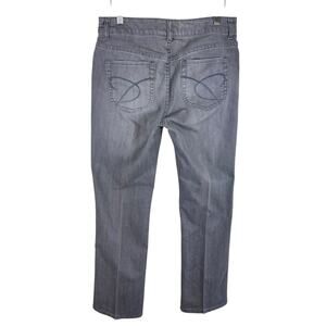 Excellent preowned condition. Gray straight leg mid rise jeans. Zipper/button closure. 5-pocket design. Cotton/Elasterell material. Approx. measurements: Waist 31", inseam 30", rise 9". Size 0.5 (6).