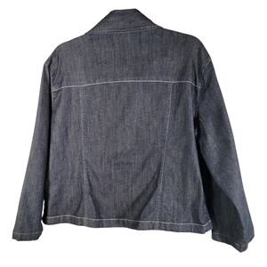 Chico’s Platinum Collection denim jean jacket in women’s Size 2 (equivalent to US 12). Crafted from a comfortable stretch blend (97% cotton, 3% spandex) for flexible wear. Features a dual front closure with interior snaps and exterior zip-up layer. Dark blue wash with long sleeves, front pockets, and contrast stitching.