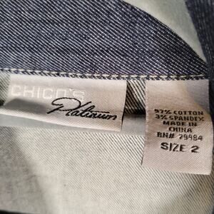 Keywords: Chico’s Platinum, dual closure, snap & zip, jean jacket, size 2, dark wash denim, women’s outerwear, zip front, wind protection, classic denim, medium wash, transitional jacket