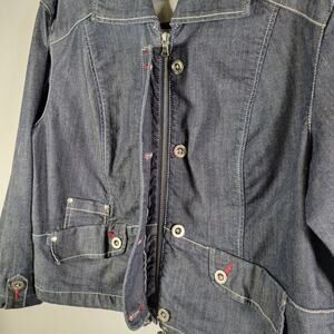 Chico’s Platinum Denim Jean Jacket Size 2 Blue US12 Dark Wash Snap Zip Stretch