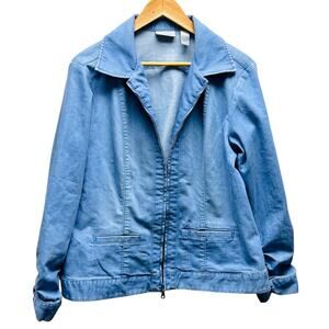 Chico’s Platinum zip-up jacket in women’s size 3, which fits like a U.S. XL (16–18). This lightweight denim-style jacket is perfect for layering, with a soft feel and medium blue tone. Features a casual zip front and relaxed fit.