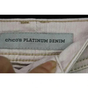 This is a pair of Women's Chico's Platinum Denim Capri's. They are beige and have cuffs. They are a size 2. They are 74% Cotton, 24% Polyester, and 2% Spandex. They have a lot of stretch. They have a 35" waist and the inseam is 23". The rise is 10". In great condition.