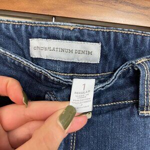 Chico's Platinum Denim Womens Dark Wash Straight Leg Stretch Jeans Size Medium/8. Chico's size 1= medium/8. Measurements Waist: 31" Inseam: 32" Rise: 10" Offers always welcome! Measurements are approximations taken while hanging