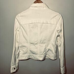 Chico's Platinum Jacket White Cotton Denim Full Zip Tie Neck Vacation Casual