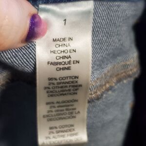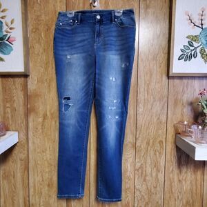 Distressed, frayed denim jegging in the Platinum style from Chico's. Excellent condition, patches under leg holes is part of the design, verified via the Chico's website.