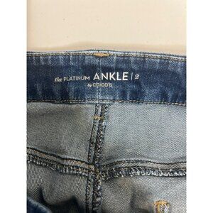 Chico's Platinum Sz 2 (US 12 L) jeans are fashionable and versatile with a boho touch. These roll cuff crop jeans feature a stunning lace appliqué detail that adds a unique style.