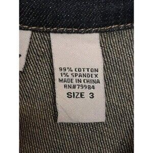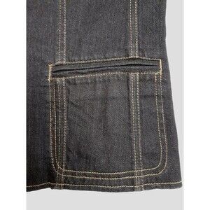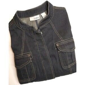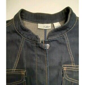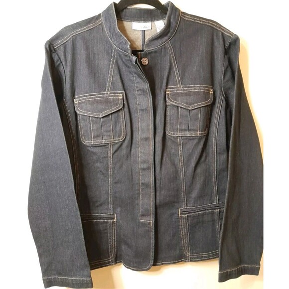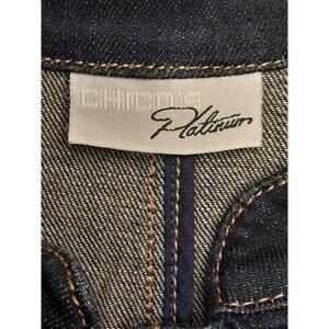 Chico's Platinum dark blue denim jacket. The jacket is tailored with stitched seaming and has pockets and covered buttons. In New Condition Without Tags.