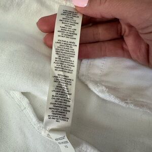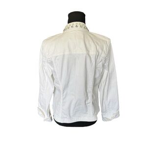 Chic and standout Chico’s Platinum Collection white jacket in size 1 (equivalent to a Medium). Features striking rhinestone and faux pearl embellishments along the front placket and collar for a bold, elegant statement. Crafted from a comfy stretch blend of 98% cotton and 2% spandex.