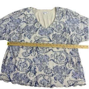 Elegant Chico’s pleated blouse featuring a delicate blue floral pattern on a white background. The pleated texture and lightweight material create a flattering drape that moves beautifully with you. Perfect for spring and summer wear or layering under a blazer for work.