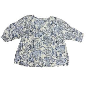 Chico’s Pleated Floral Print Blouse Blue White V-Neck Short Sleeve Top Size 1 M