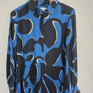 Chico's Pleated Tiered Shirt Dress Women Sz M-L Blue Black Long Sleeve Coastal
