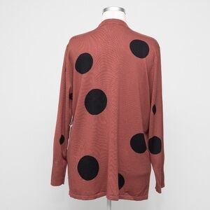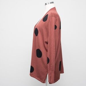 Playful yet chic, this open-front cardigan features oversized black polka dots against a rich rust backdrop. Made from a soft, lightweight knit, it drapes effortlessly for a relaxed fit that’s easy to layer over your favorite tees or blouses. Perfect for adding a touch of whimsy to everyday looks while keeping cozy through the season.