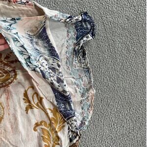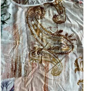 abstract art to wear coastal cowgirl western bohemian hippie retro whimsigoth fairy cottage outdoor vacation patchwork mixed print pattern geometric boat neck short sleeve flowy lightweight casual wrap shawl pullover blouse xlarge relaxed slouchy chicos 2 3 white brown beige cream blue gold orange purple multi multicolor