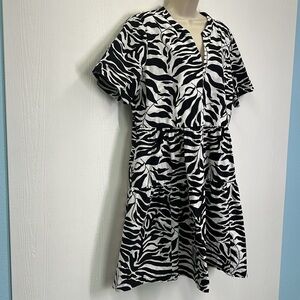 Chicos - Poplin Black And White Palm Print V Neck Short Sleeve Dress Size 14