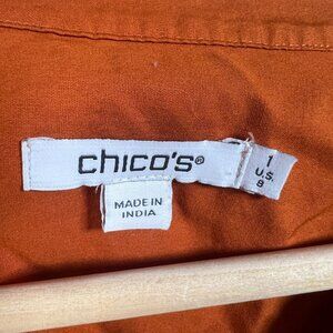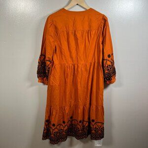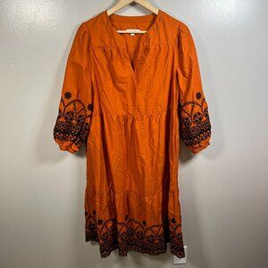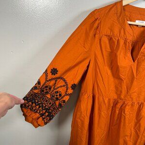 Chicos Poplin Embroidered Midi Dress Size 8 Orange Fall Boho Balloon Sleeves