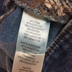 Medium washed jean color, stretch, faux pockets in front, 2 pockets in back, embellished with rhinestones on the front faux pocket area