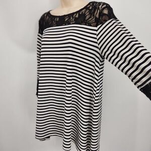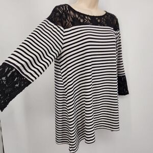 Chico's Pullover Blouse Size 1(M) Black & White Stripe Lace Accents