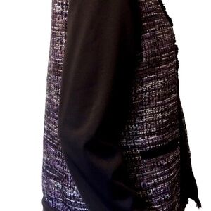 New with tags Chico’s black and purple open-front mixed tweed jacket. The tweed shimmers with golden threads and subtle pops of purple. Grosgrain ribbon trims the fringe on the textured silhouette. Features hand pockets and subtle shoulder pads. Runs slightly small.