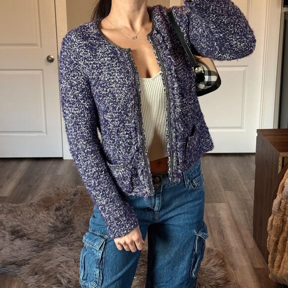 Gorgeous textured knit cardigan with clasp front in purple/marled tones. Chanel-inspired vibe with subtle metallic trim. Elevated layering piece with cozy chic coquette aesthetic.