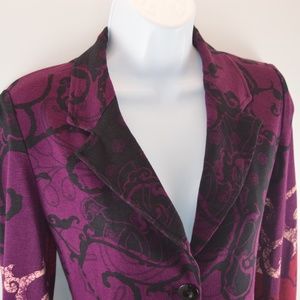 Chico's Purple, Black, Off White, Pink Abstract Paisley Print Blazer Jacket. Long Sleeve with collar and lapel. 4 Black front buttons and two waist height front pockets. In good pre-owned condition. Shell 87% Rayon, 10% Nylon, 3% Spandex. 100% Polyester lining. Size 0
