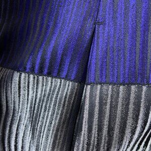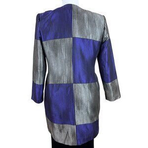 This Metallic Purple & Silver Colorblock Women's Jacket stands out with its open front design and bold geometric pattern. It features 3/4 sleeves and a comfortable fit, ideal for modern and chic outfits. Crafted with high-quality materials for a sleek, sophisticated look. Perfect for formal or semi-formal wear.