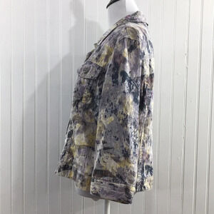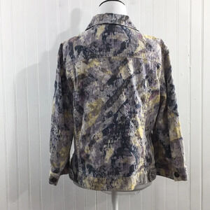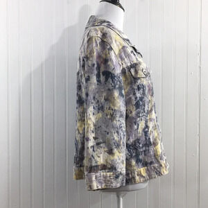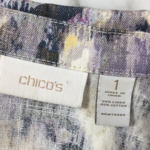 Chico's Purple Yellow Abstract Jean Jacket Womens 1 Medium 8 Linen Cotton Denim. Button front closure. Two flap front pockets. 55% Linen, 45% Cotton. Pre-owned Condition- no flaws, no rips, stains, or holes.
